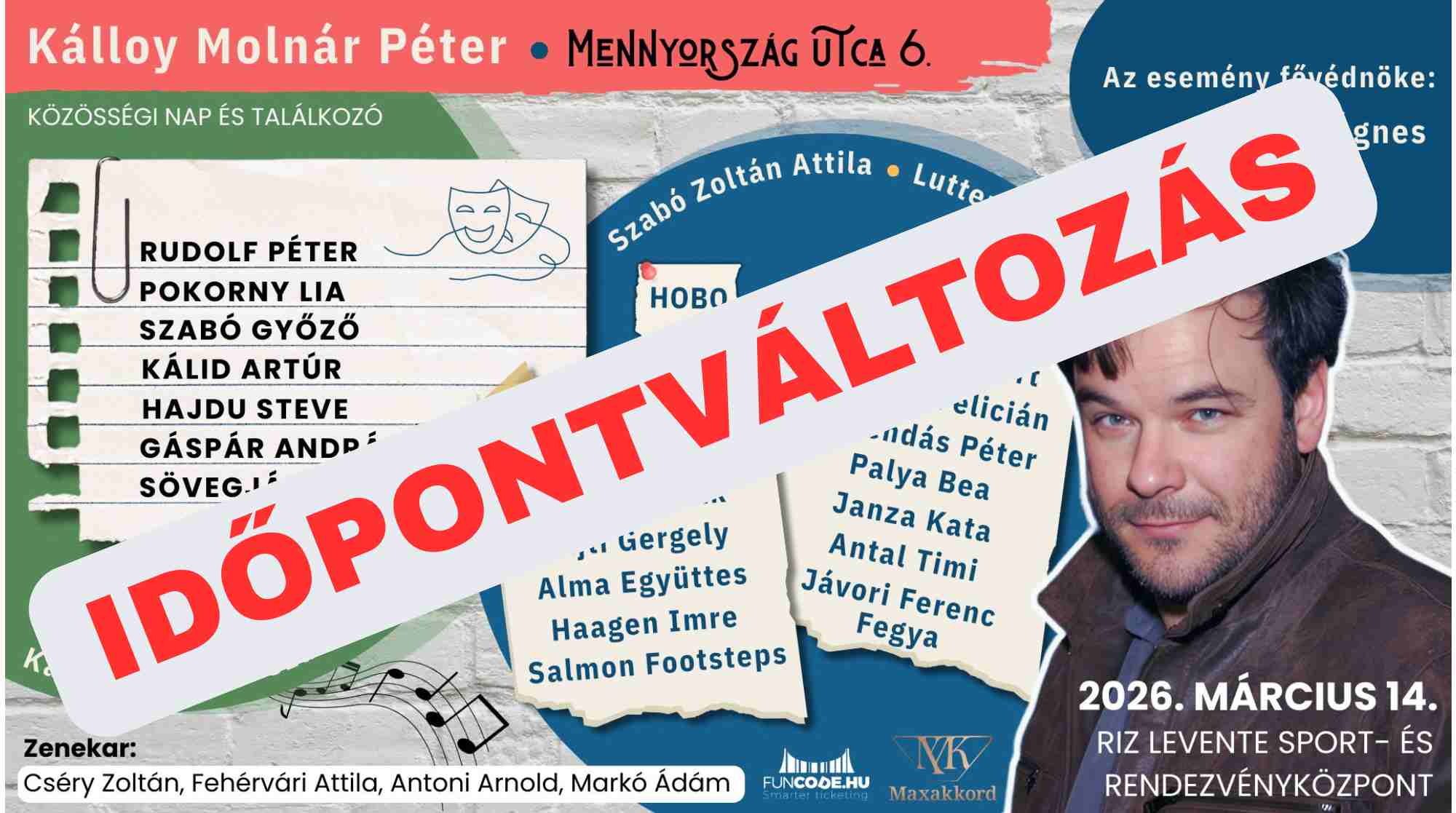 Ezúton tájékoztatjuk Önöket, hogy sajnálatos módon a 2026. március 14-re meghirdetett Kálloy Molnár Péter „Mennyország utca 6.” Közösségi nap és Találkozó a tervezett időpontban és helyszínen nem kerül megrendezésre.